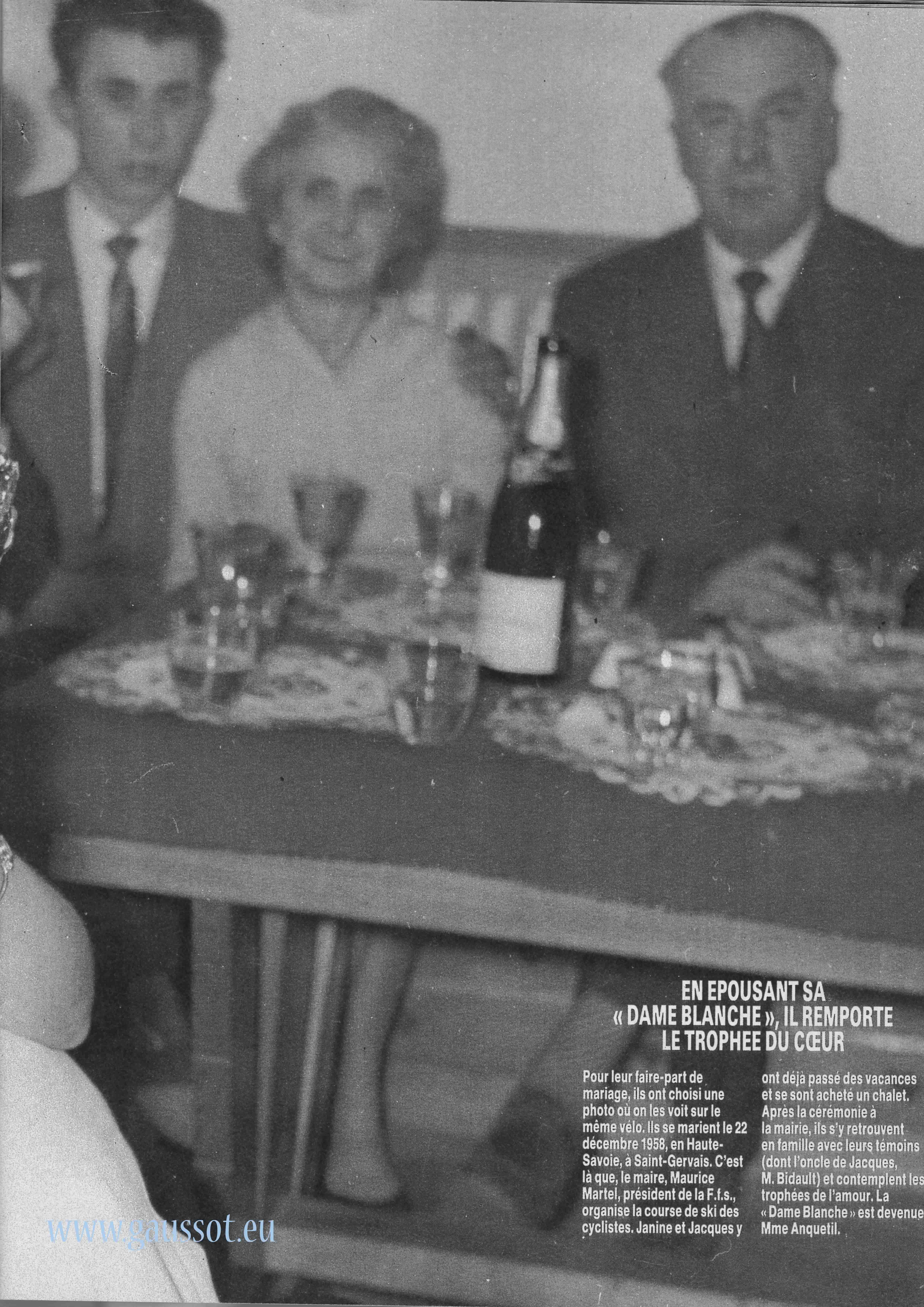 Anquetil, l'histoire d'un géant, par Jacques Goddet, Jean Cau, André Darrigade et Raymond Poulidor (Paris Match, numéro 2009 hors série, novembre 1987) (ce numéro, paru après le décès de Jacques Anquetil le 18 novembre 1987, publie deux photos double-page du champion cycliste avec son épouse Janine, prises par Philippe Gaussot ; la seconde fut prise le 22 décembre 1958, jour de leur mariage, à Saint-Gervais)